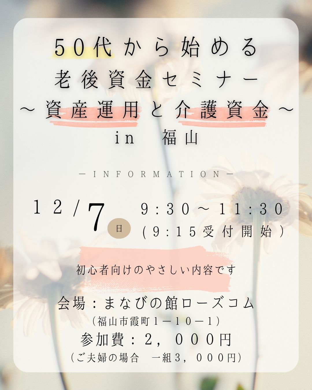 9月開催の『 働く女性のためのマネー講座in東広島』のご案内です。